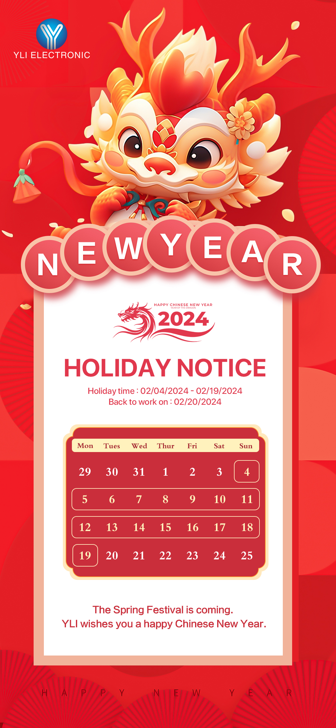 We hereby inform you that our company and factory will be on Chinese New Year holiday