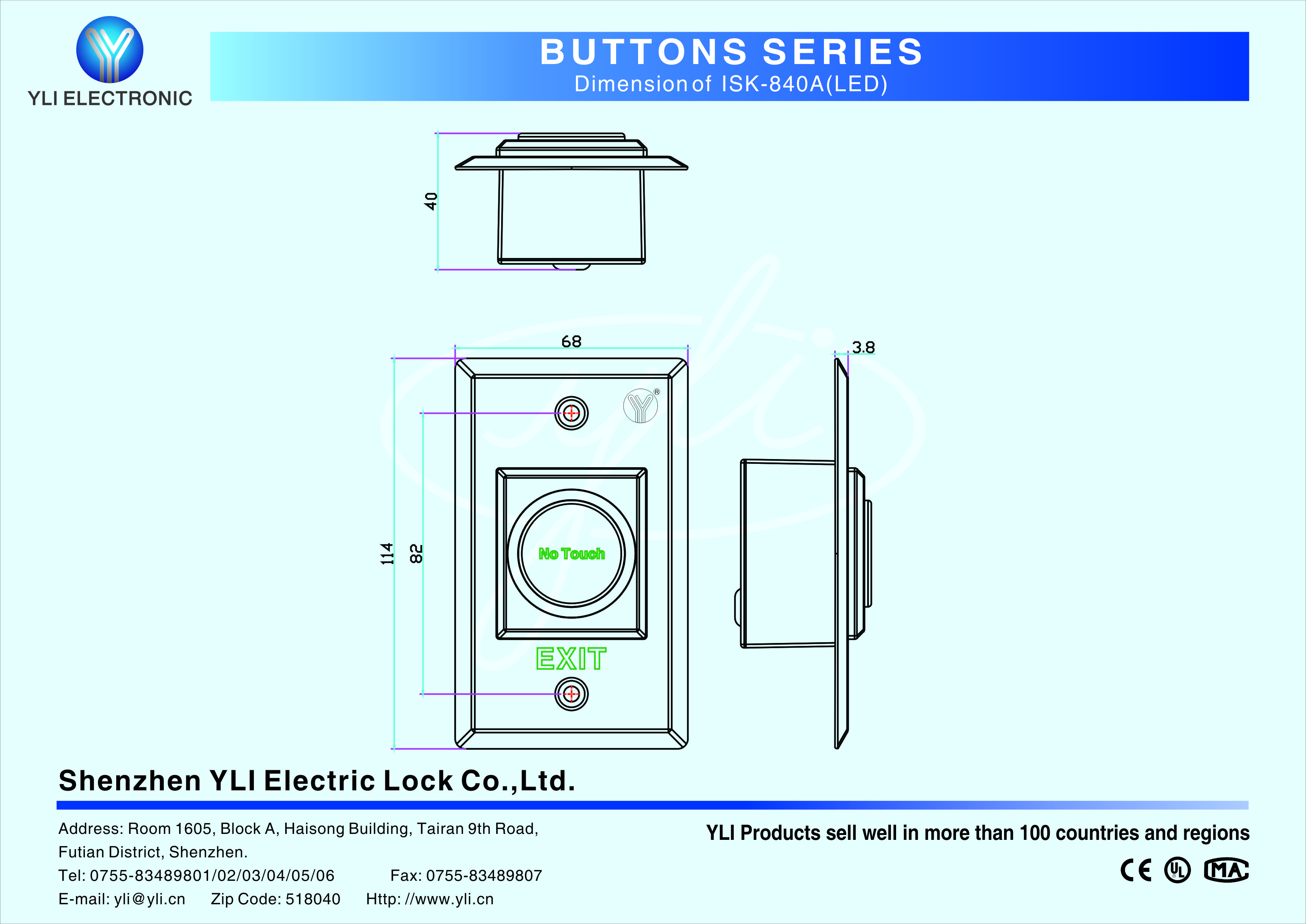 ISK-840A is an Infrared Sensor Exit Buttonin size of 115Lx70Wx29H(mm) suitable for all kinds of locks. Blue LED Lighting. Induction distance 0.1-10cm.