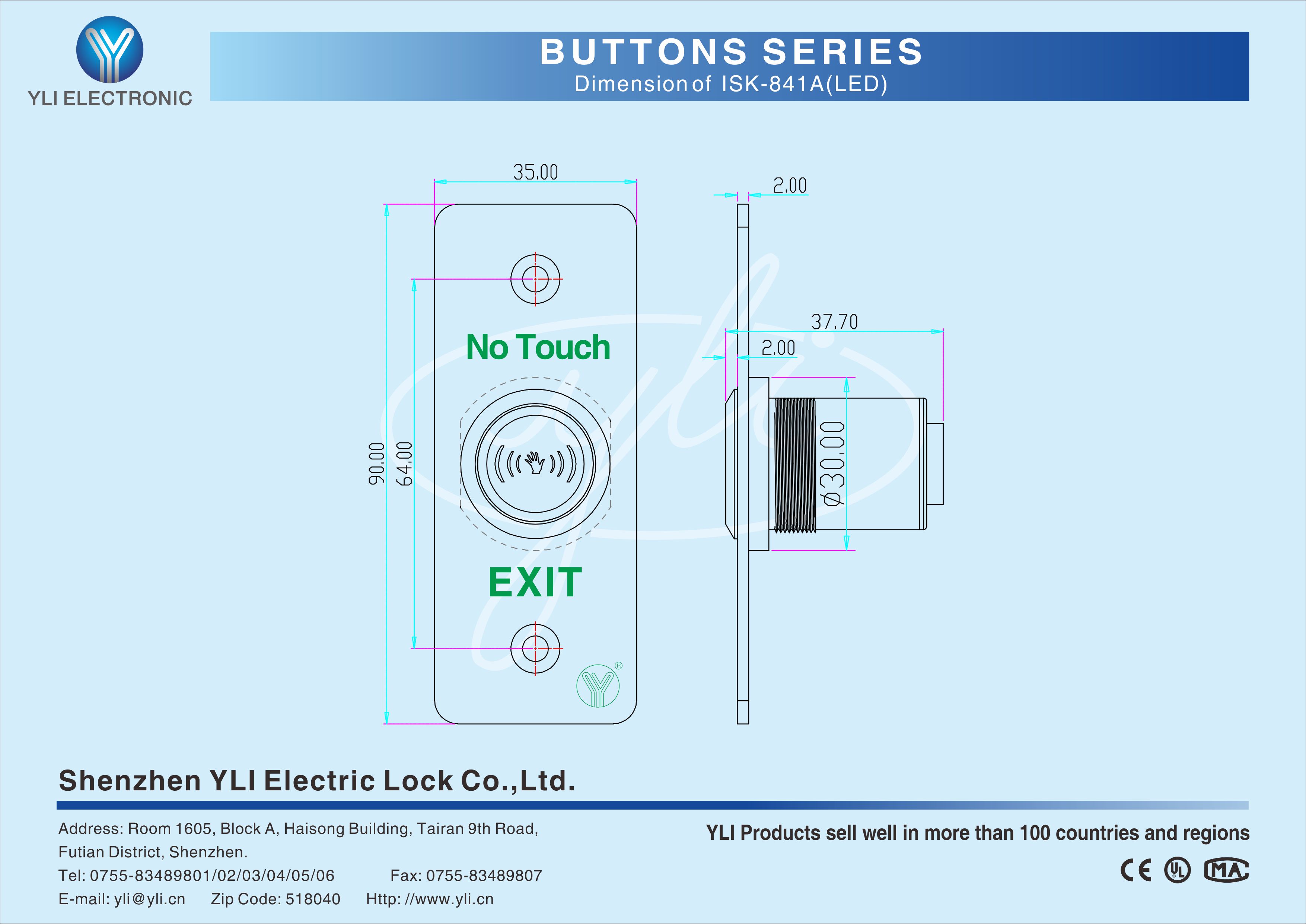 ISK-841A is an Infrared Sensor Exit Button with stainless steel in size of 90Lx35Wx37.7H(mm) suitable for all kinds of locks. 4-12cm induction distance is adjustable, 1~25S Time delay is adjustable. Red??LED indicator: Power ON(standby);Green LED indicator: Power ON(sensation).