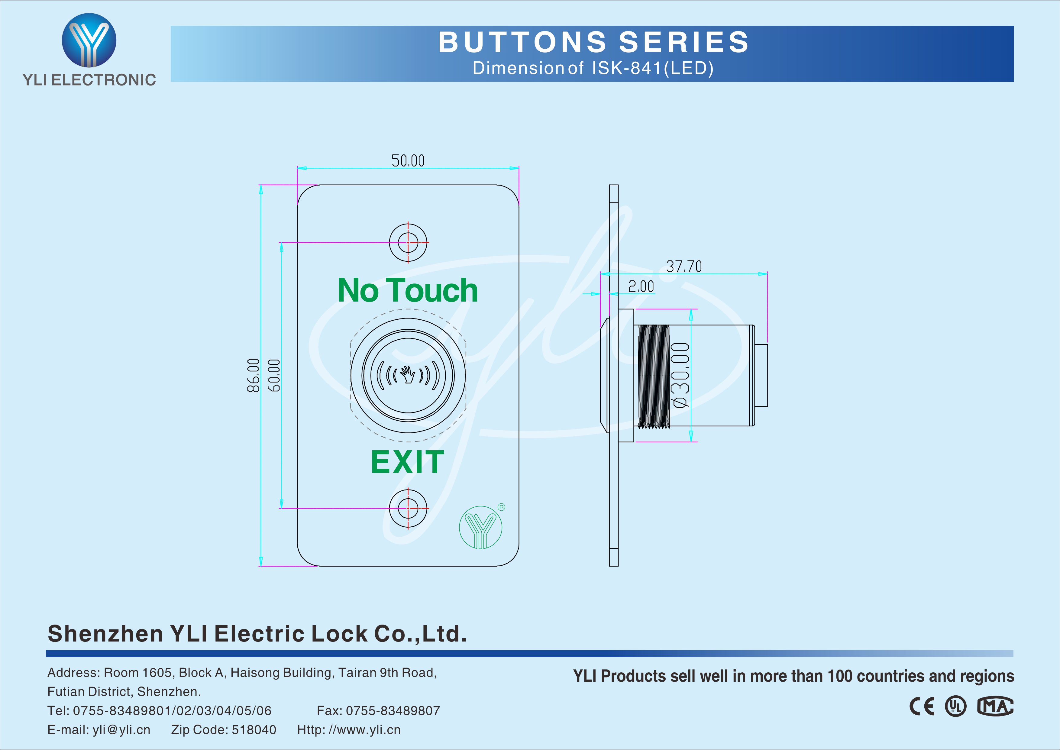 ISK-841B is an Infrared Sensor Exit Button with stainless steel in size of 86Lx50Wx37.7H(mm) suitable for all kinds of locks. 4-12cm induction distance is adjustable, 1~25S Time delay is adjustable. Red??LED indicator: Power ON(standby);Green LED indicator: Power ON(sensation).