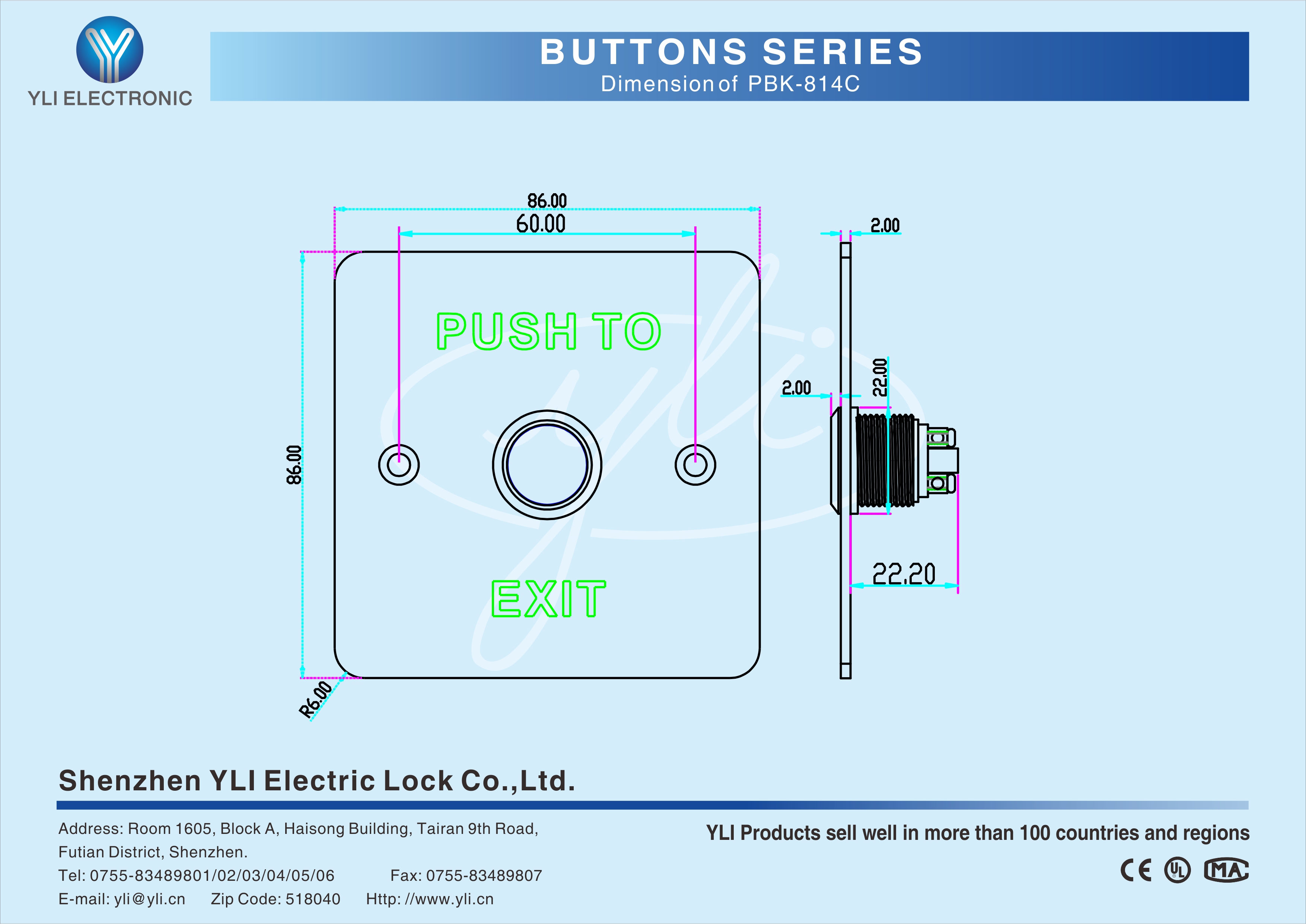 PBK-814C is a stainless steel door release button with size of 86Lx86Wx31H(mm), which is the most common and the most frequently used in the access control systems.