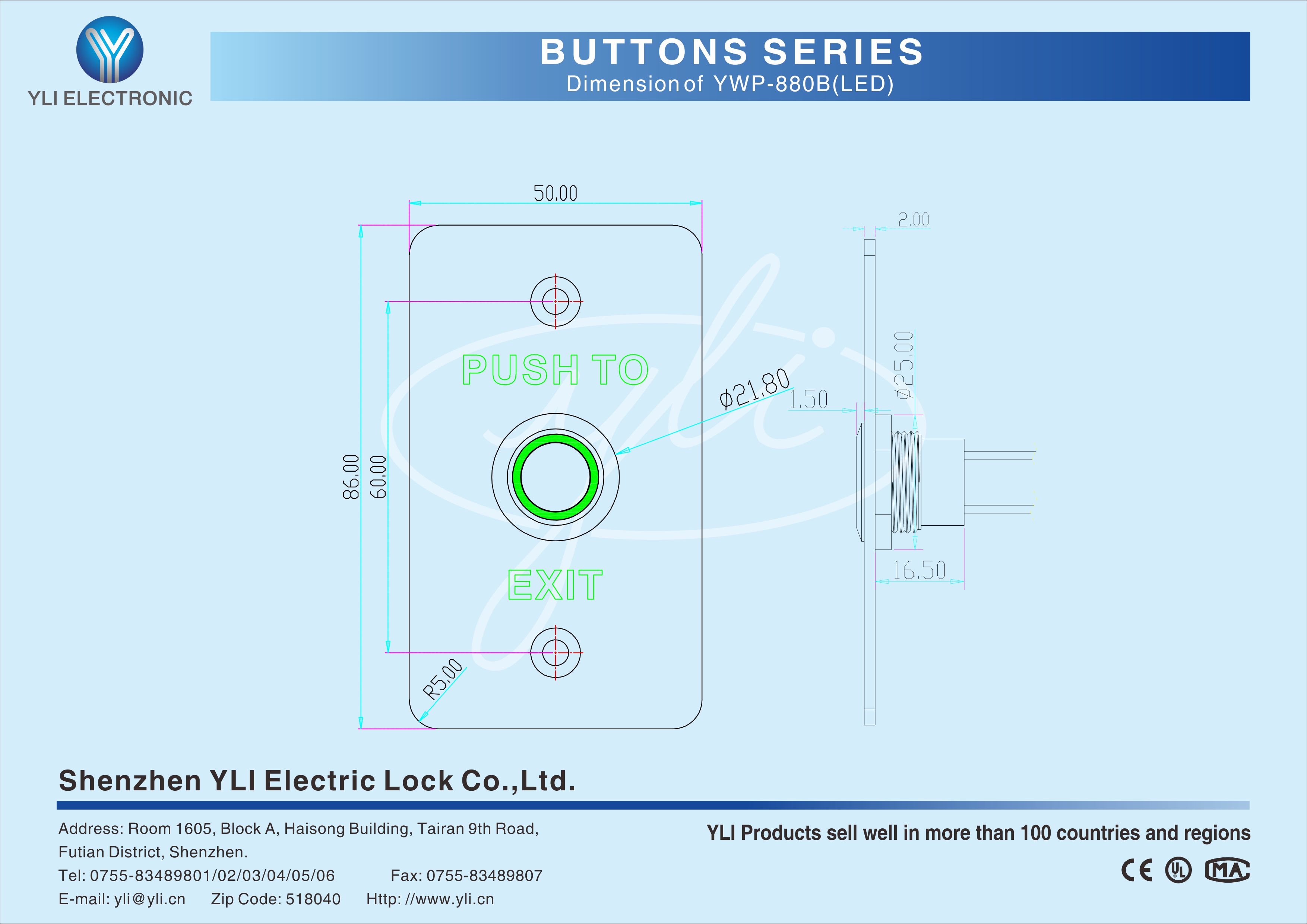 YWP-880B(LED) is a stainless steel door release button with LED in size of 86Lx50Wx20H(mm), IP-67 waterproof design, dustproof, American standard,which is the most common and the most frequently used in the access control systems.