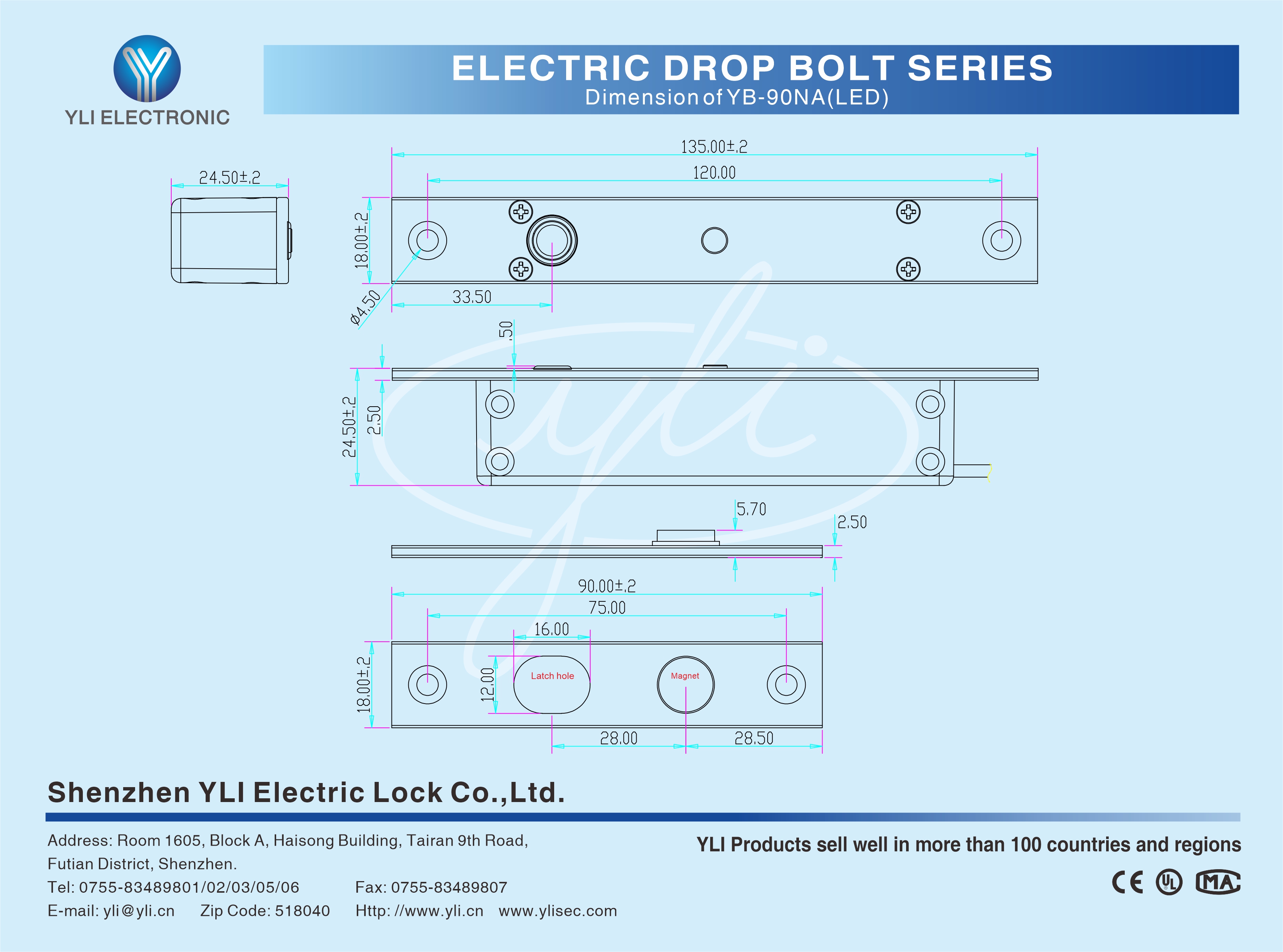YB-90NA(LED) is an Mini Electric Bolt,which is manufactured by 304 type of stainless steel with special design.The linkage,manufactured by lathe,can withstand 600kg holding force.The special design of all-metal linkage parts results it can bear with the temperature of 60 ℃ or?-30 ℃ below zero,it pass through security test after it has been used for over 1 million times