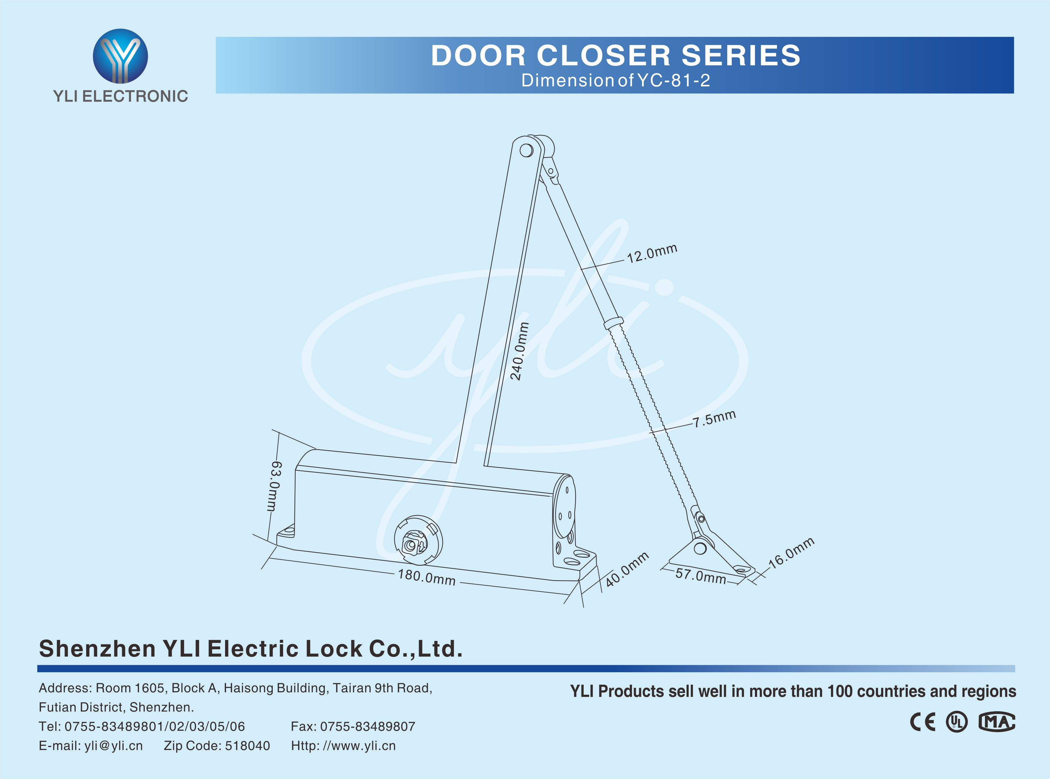 Door closer is installed at the top of the door leaf with single opening, is applicable to wooden door、steel door and fire door.