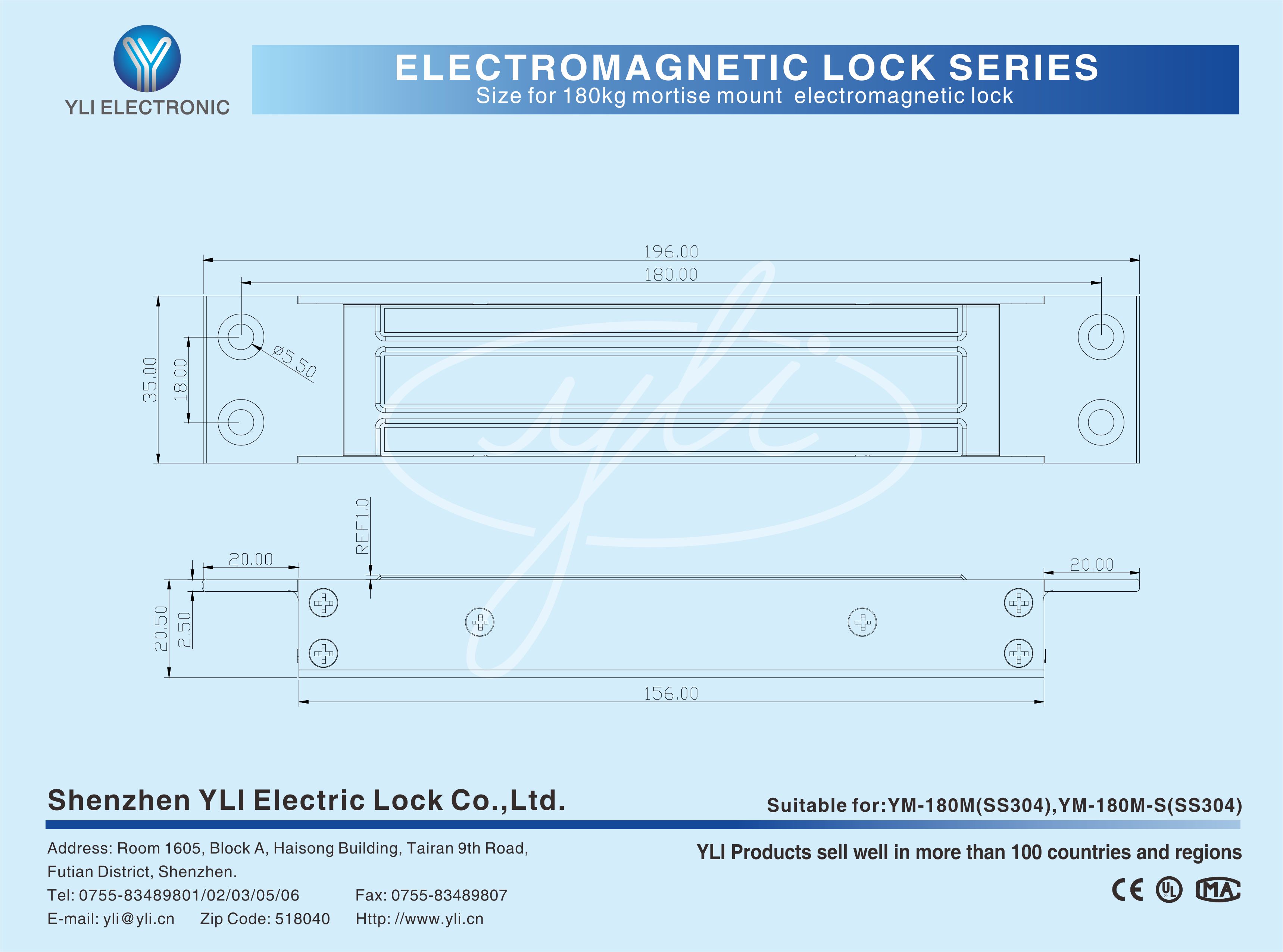 YM-180M(SS304)/YM-180M-S(SS304) Single door mortice magnetic lock is designed for wooden door, metal door, glass door, fire-proof door. The shell and instalation structural parts are made of 304 stainless steel to prevent the deformation or fracture when the door is opened and closed forcefully. There is a set of lock status signal (NO/NC/COM) output contacts, which provides real-time feedback for the access control system. YLl magnetic lock cores are produced with robotic laser welding technology, providing 2 to 3 times stronger impact resistance and torsional resistance than conventional production processes. The surface is treated with the internationally leading electroplating process and the lock itself has passed the 240-hour salt spray test in the national laboratory, achieving excellent performance of anti.oxidation, anti-rust and anti-corrosion. Our company offers a complete range of brackets for different locks.