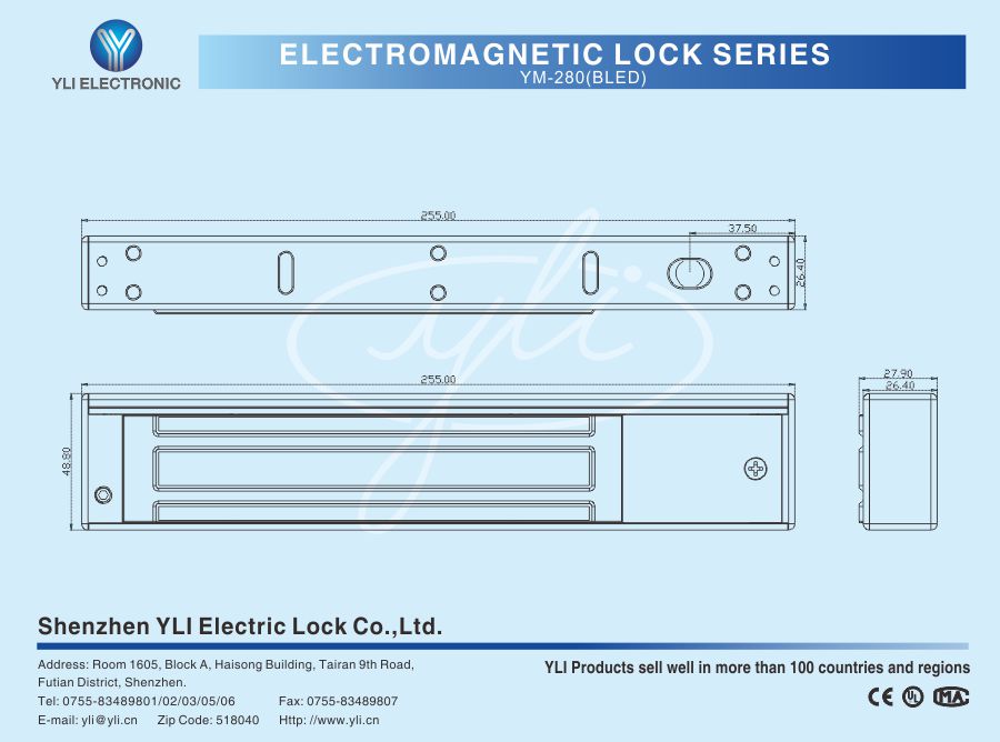 YM-280(BLED) Single door magnetic lock is designed for wooden door, metal door, glass door and fireproof door. There is a set of lock status signal (NO/NC/COM) output contacts. The lock body is equipped with a large LED light, The green light indicates unlocking, and the red light indicates locking. YLl magnetic lock cores are produced with robotic laser welding technology, providing 2 to 3 times stronger impact resistance and torsional resistance than conventional production processes. The surface is treated with the internationally leading electroplating process and the lock itself has passed the 240-hour salt spray test in the national laboratory, achieving excellent performance of anti-oxidation, anti-rust and anti-corrosion. Our company offers a complete range of brackets for different locks.