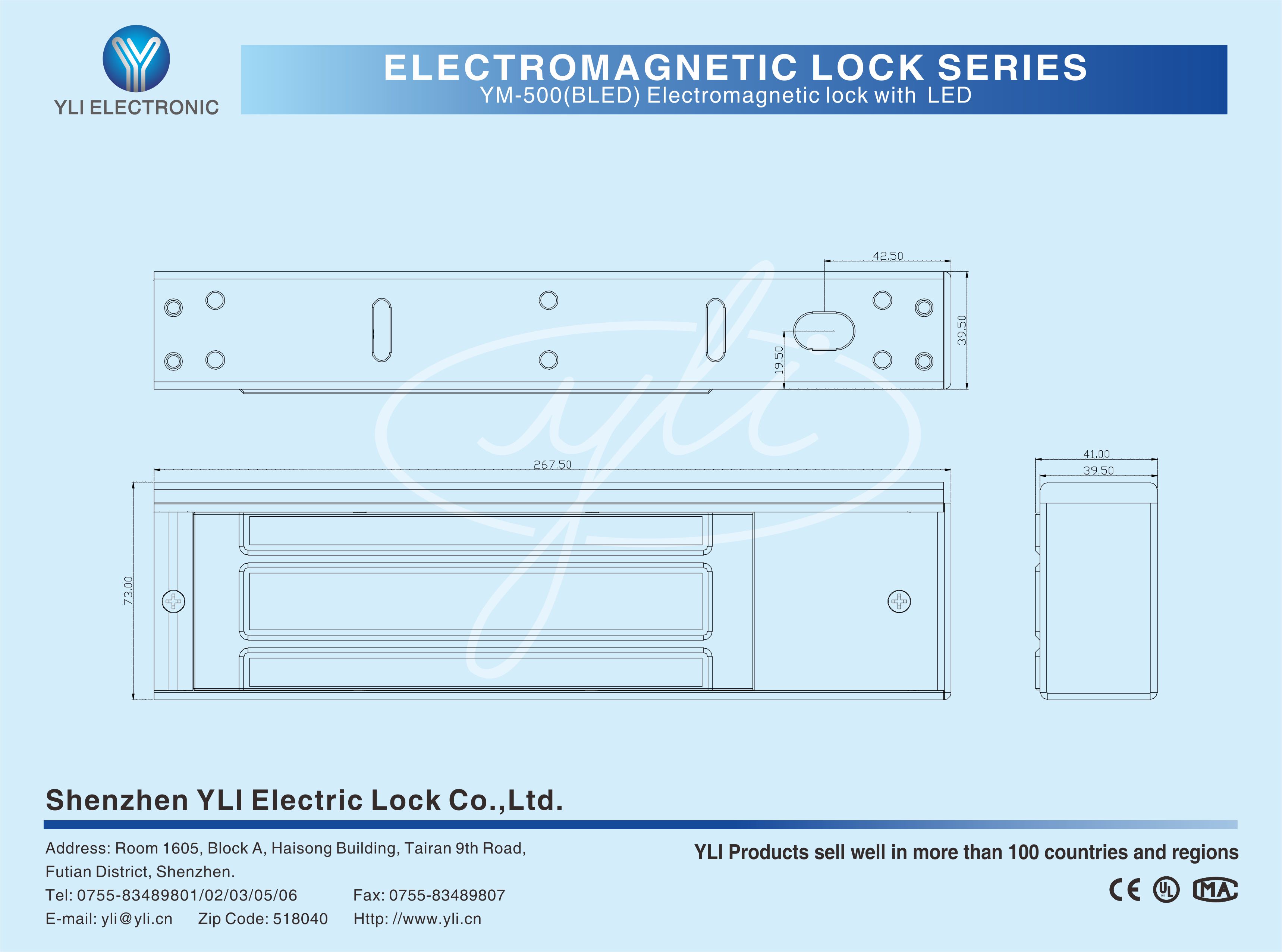 YM-500(BLED) Single door magnetic lock is designed for wooden door, metal door, glass door and fireproof door. There is a set of lock status signal (NO/NC/COM) output contacts. The lock body is equipped with a large LED light, The green light indicates unlocking, and the red light indicates locking. YLl magnetic lock cores are produced with robotic laser welding technology, providing 2 to 3 times stronger impact resistance and torsional resistance than conventional production processes. The surface is treated with the internationally leading electroplating process and the lock itself has passed the 240-hour salt spray test in the national laboratory, achieving excellent performance of anti-oxidation, anti-rust and anti-corrosion. Our company offers a complete range of brackets for different locks.