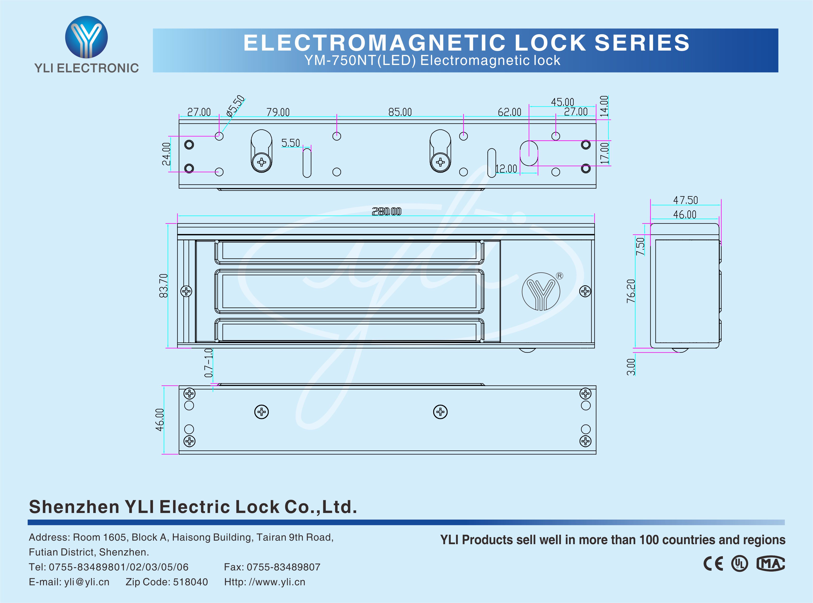 YM-750NT(LED) Single door magnetic lock is designed for wooden door, metal door, glass door and fireproof door. It has an adjustable time delay function of 0/3/6/9 seconds. There is a set of lock status signal (NO/NC/COM) output contacts, which provides real-time feedback for the access control system. The lock body is equipped with a large LED light. The green light indicates unlocking , and the red light indicates locking. YLl magnetic lock cores are produced with robotic laser welding technology.providing 2 to 3 times stronger impact resistance and torsional resistance than conventional production processes. The surface is treated with the internationally leading electroplating process and the lock itself has passed the 240-hour salt spray test in the national laboratory, achieving excellent performance of anti-oxidation,anti-rust and anti-corrosion, Our company offers a complete range of brackets for different locks.