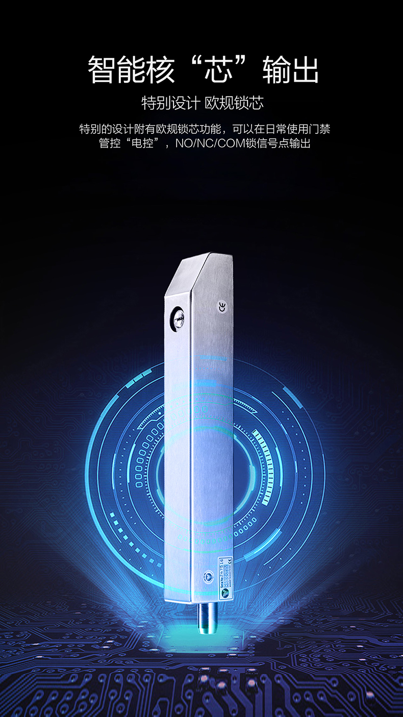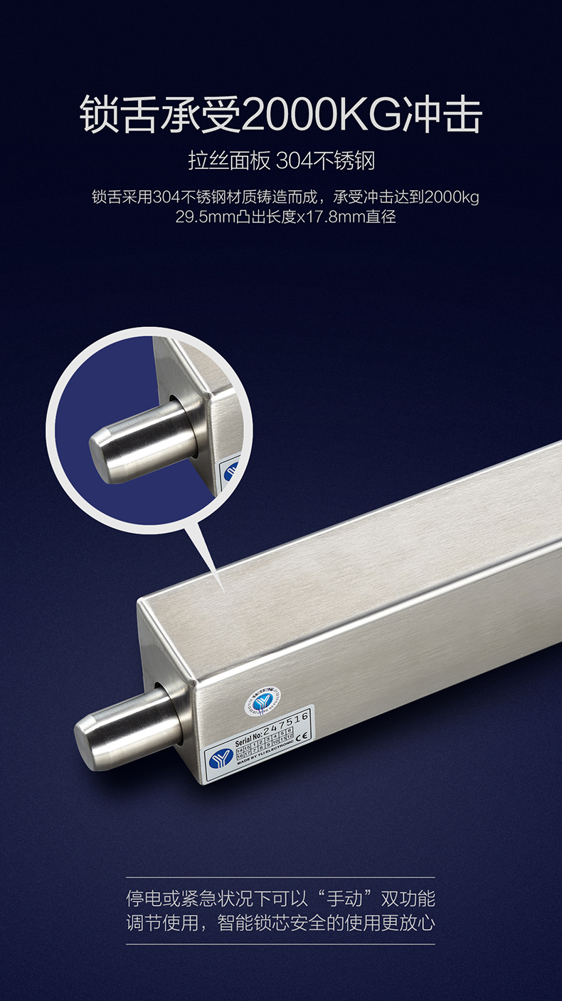 ,配有歐規鎖芯,附鎖匙功能,可以達到平時“電控”與緊急時“手動”雙用的目的。鎖舌采用整體式304不銹鋼實芯棒材,經CNC車床精工而成,可承受2000kg沖擊,