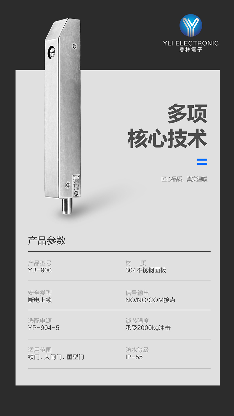 YB-900是一款明裝式設計、安裝簡便、堅固耐用,可垂直及橫向安裝,有效滿足需安保管制的各種鋼制閘門及各種重型入戶門安裝使用。