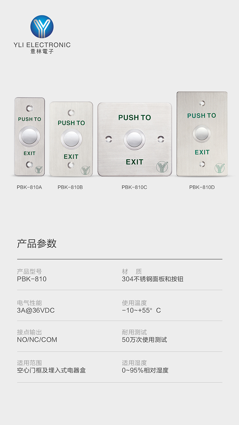 是門禁系統(tǒng)中最常見以及最常被使用到的,出門開關(guān)通常用于一般公家機(jī)關(guān)、銀行、大型、中小型企業(yè)以及百貨公司和住宅,外出開關(guān)系列有紅外線、觸控式、按鈕式、外出推把等。