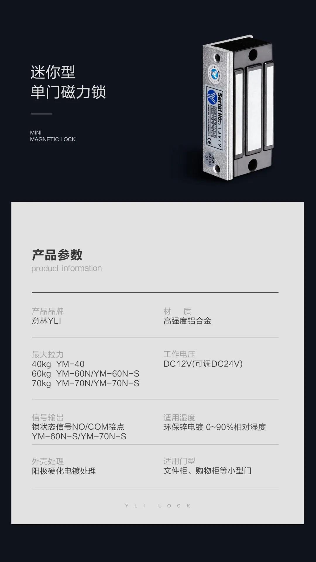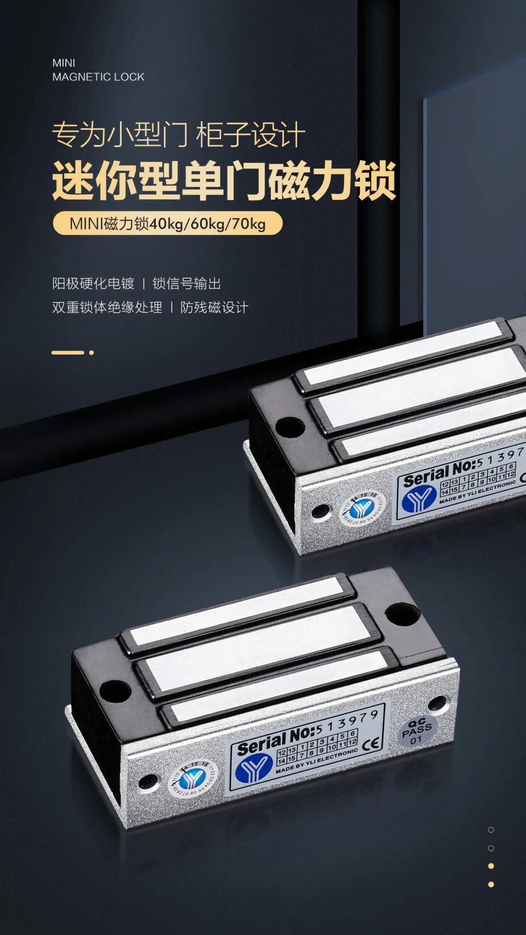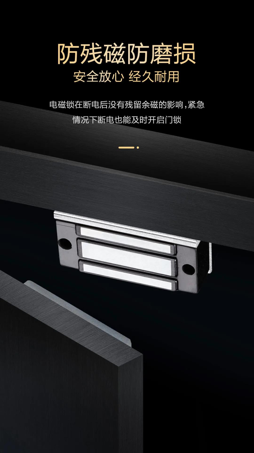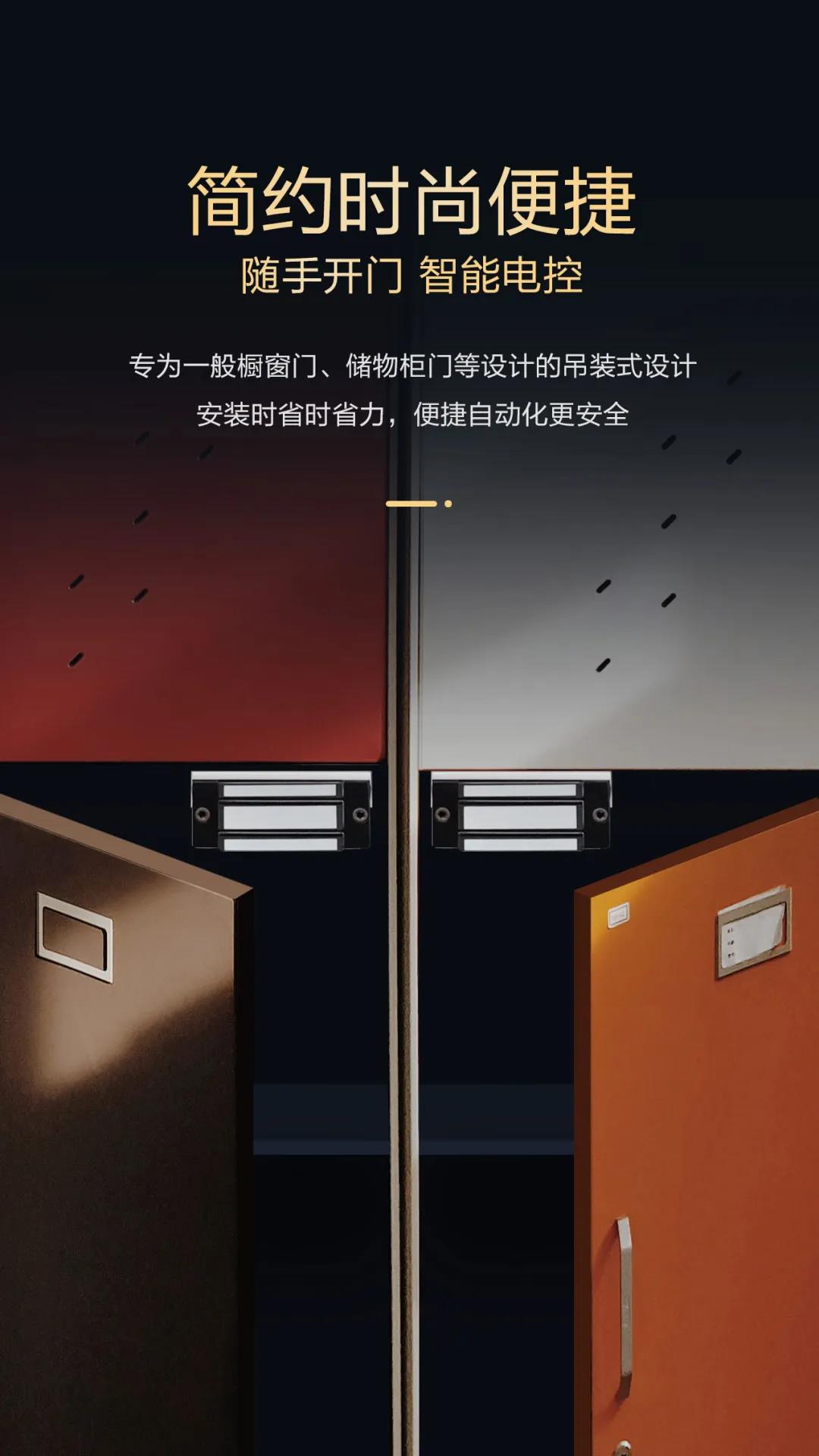 是針對一般櫥窗門、儲物柜門等小型柜門設計的,吊裝式設計,安裝時省時、省力。內開式門或無框玻璃門、窄框等均有附件配套,特殊防殘磁設計,讓門禁自動化更安全。