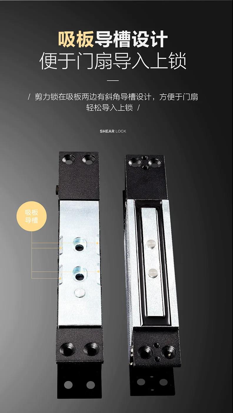是運用電磁吸力吸住吸板,讓鎖體的兩粒固定柱卡住吸板的鎖孔內,達到磁力加上固定柱卡住吸板的力量,產生非常強大的“剪力”。