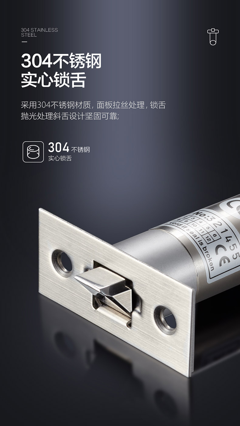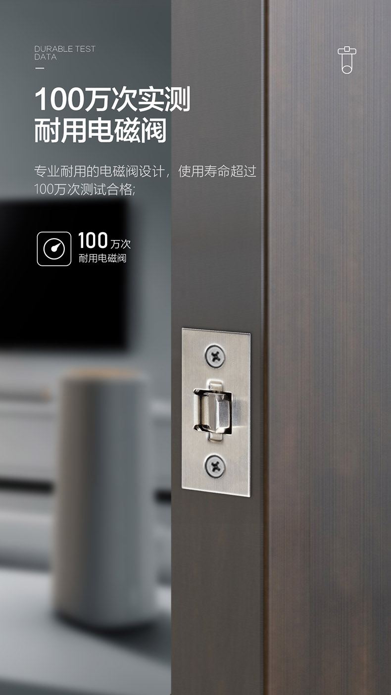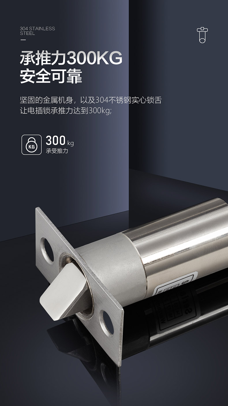 ,鎖舌采用304不銹鋼鑄造設計,連動部件經CNC車床精工而成,設計承推力300KG撞擊。在60℃高溫及零下40℃嚴寒的惡劣環(huán)境下可正常使用,耐用電磁閥設計。可連續(xù)工作100萬次測試合格。