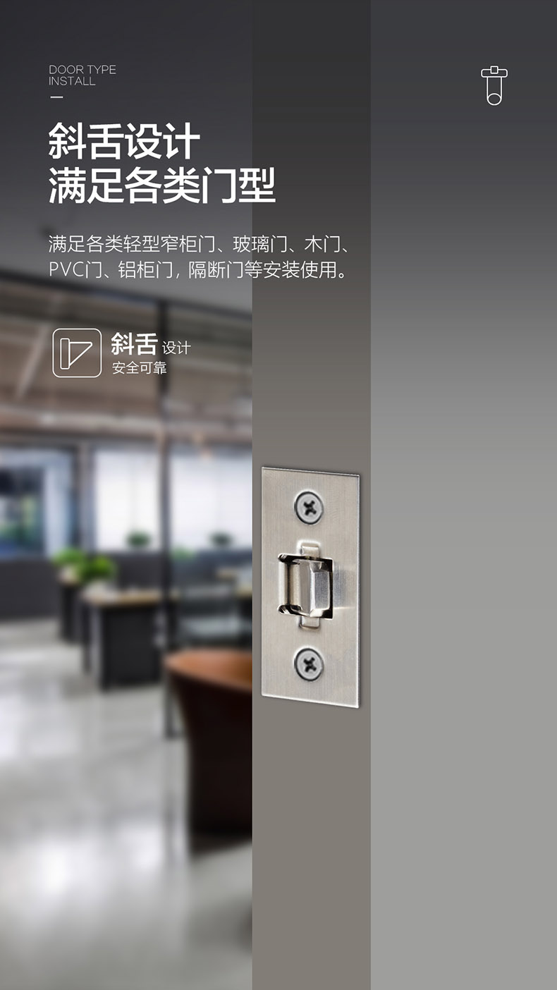 ,便于現(xiàn)場開孔安裝,斜舌設計可滿足各類輕型窄柜門、玻璃門、木門、PVC門、鋁柜門,隔斷門等安裝使用。
