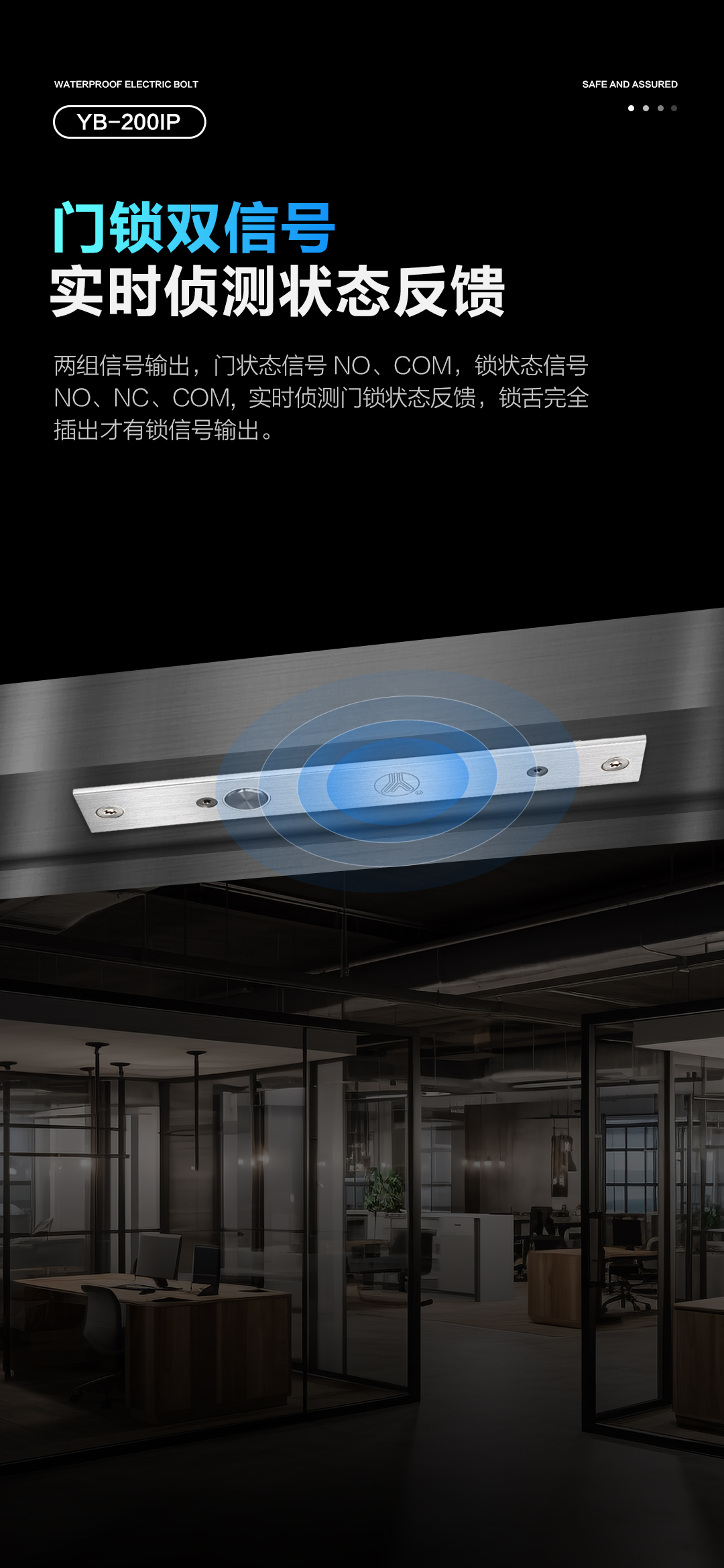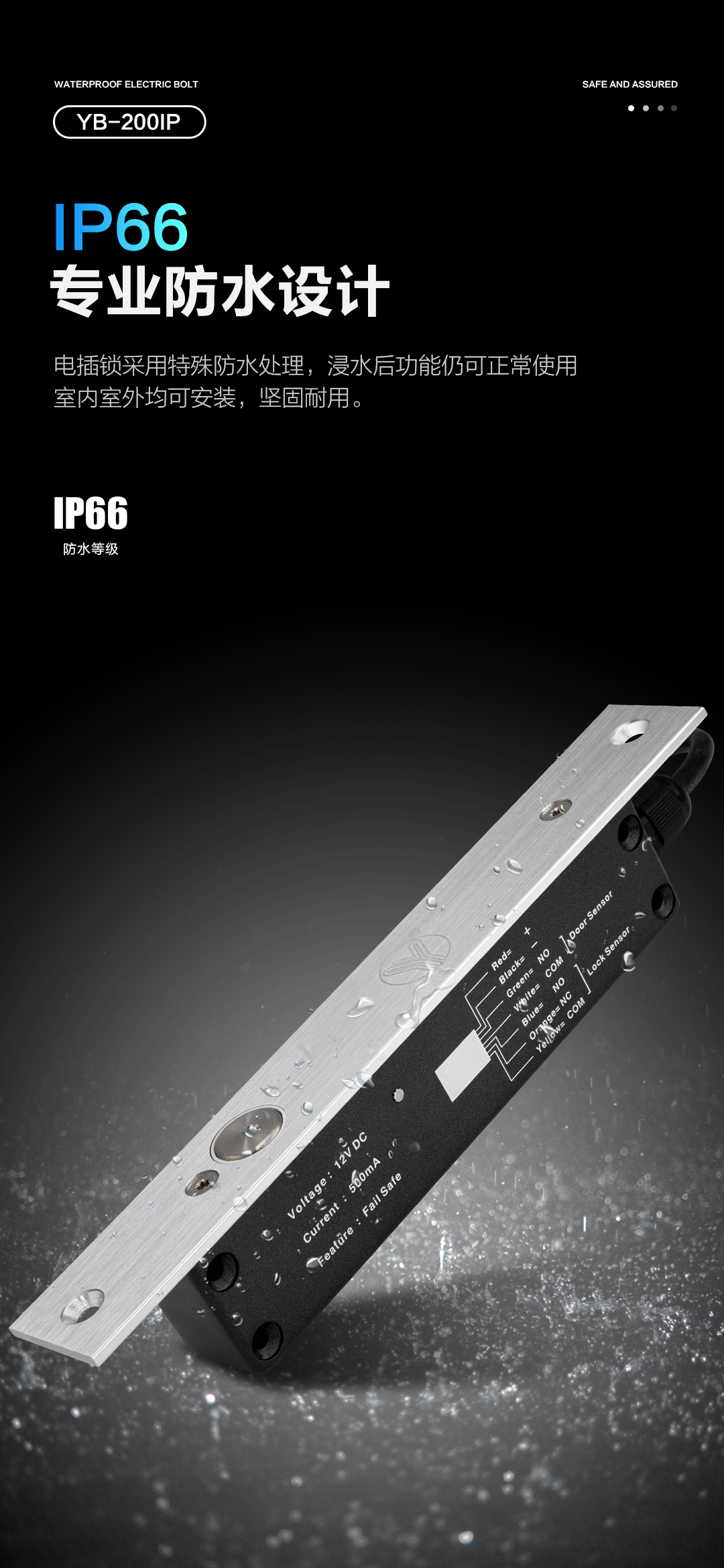 YB-200IP防水電插鎖,經(jīng)過精心設(shè)計(jì)和制造,具有優(yōu)異的防水性能,防水等級(jí)達(dá)到IP66,即使在潮濕的環(huán)境中也能保持穩(wěn)定和安全。鎖舌采用整體式304不銹鋼實(shí)心棒材,經(jīng)CNC車床精加工而成,工藝精湛,最高可承受800kg沖擊。門/鎖狀態(tài)信號(hào)輸出,實(shí)時(shí)偵測(cè)門鎖狀態(tài)反饋。專業(yè)設(shè)計(jì)的耐用型電磁閥,使用壽命超過50萬次測(cè)試合格。