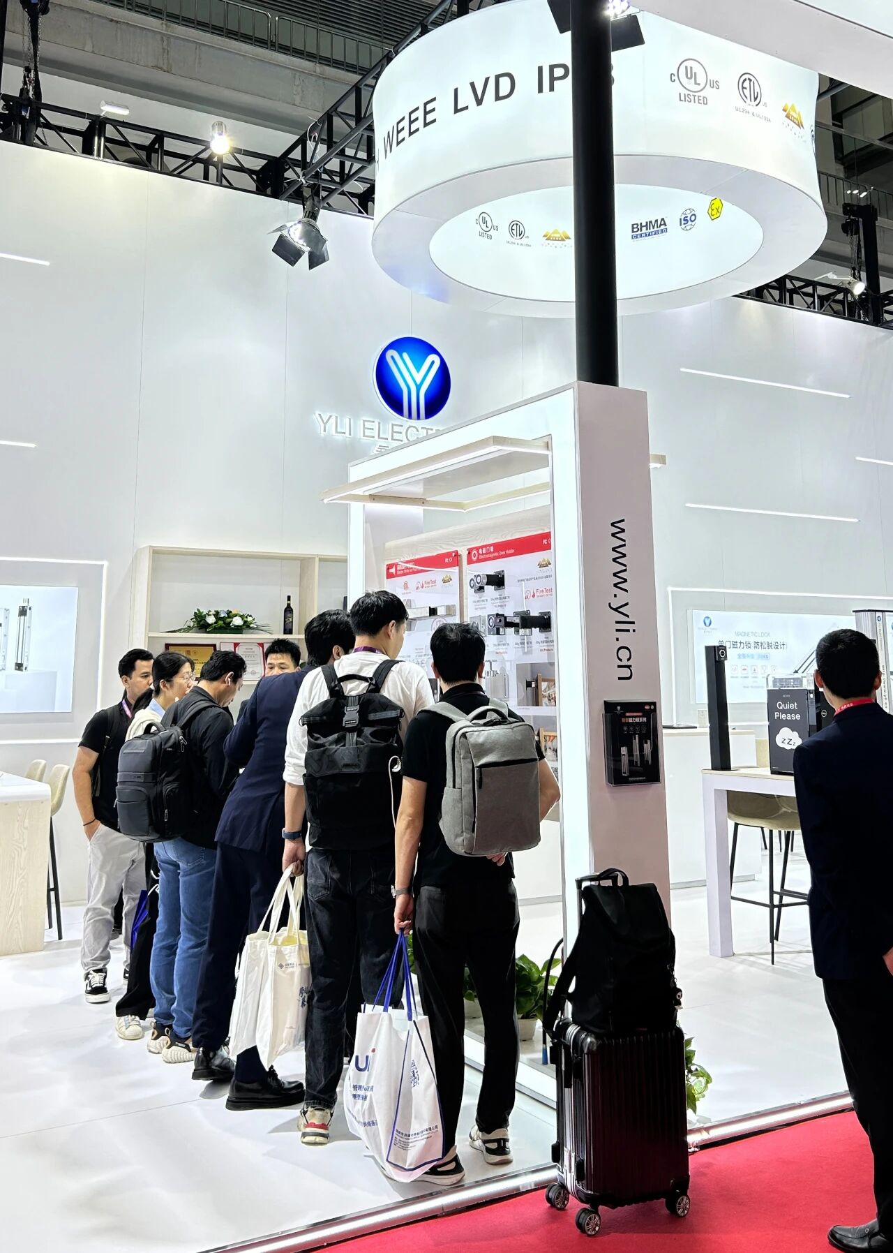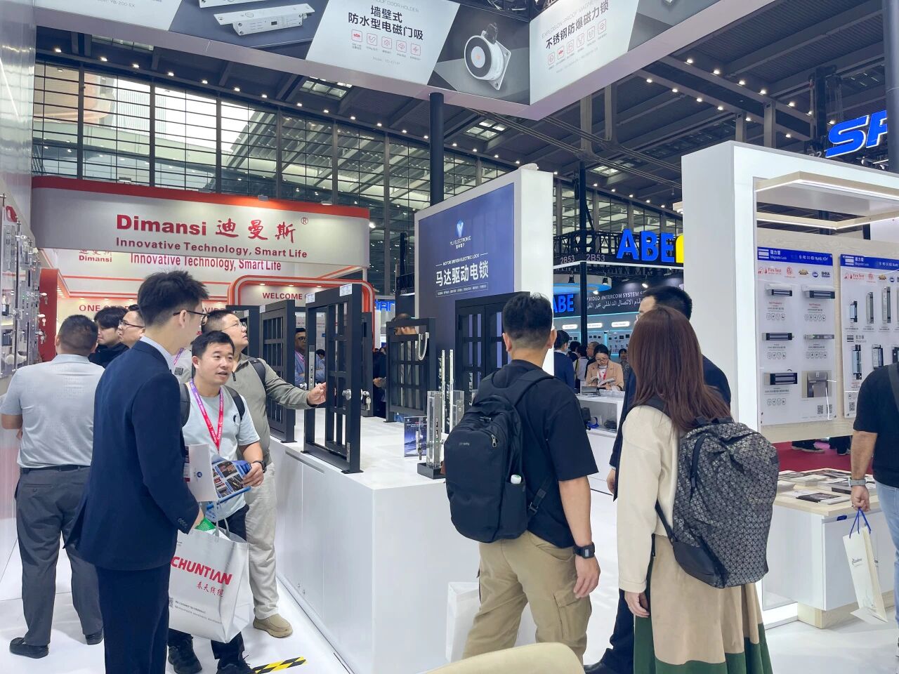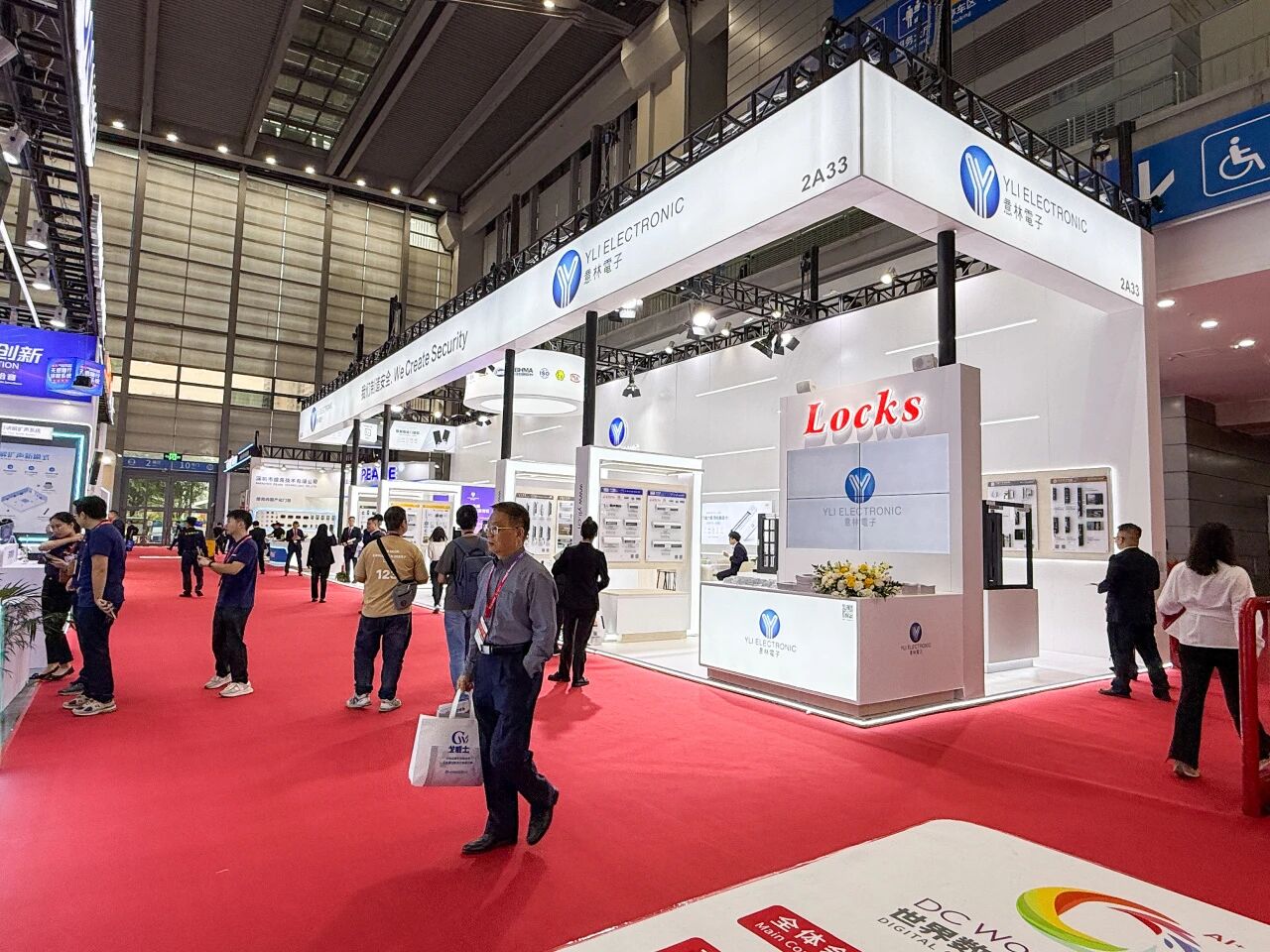 展會首日,會展中心門口排滿長隊,意林電子攜眾多門禁電鎖新品和一體化解決方案亮相2號館2A33,“我們制造安全” 的主題格外醒目。意林展位設計采用開放式布局,以白色為主色調,搭配明亮的燈光效果,營造出專業而科技感的氛圍。不到半小時,意林電子展位前便圍滿了咨詢的客戶。