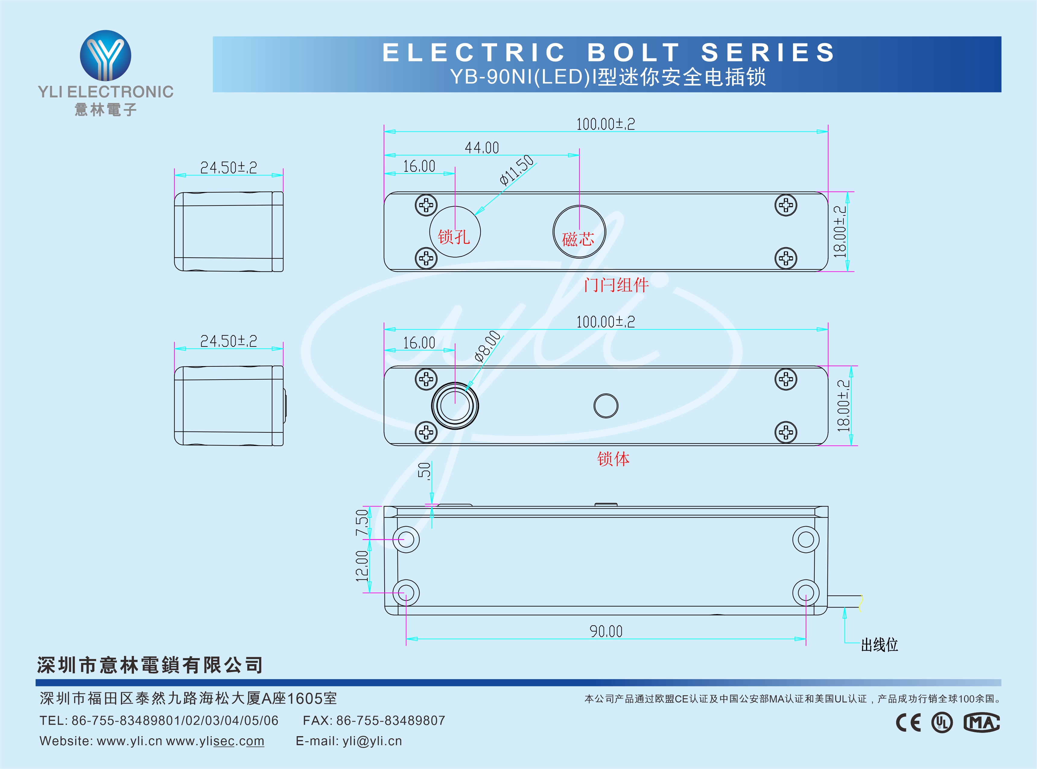 YB-90NI(LED)是一款全金屬結構的窄框門專用智能電插鎖,鎖舌采用整體式304不銹鋼實芯棒材,經CNC車床精工而成,可承受600kg沖擊而且鎖舌插出后防撬功能的特殊高保安設計,連動部件全部采用金屬結構,在60℃高溫及零下30℃嚴寒的惡劣環境下可正常使用,專業耐用型電磁閥,特殊光電控制超低溫及超低功耗設計。防入侵電路及智能邏輯電路設計等,多功能綜合于一體,是一款有效滿足上下外露式安裝于窄框金屬門、木門、PVC門使用的最佳產品。