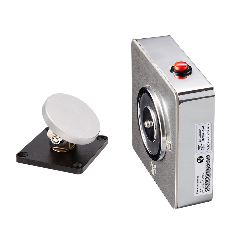 YD-603墻壁型防火電磁門吸,電磁門吸可單獨使用或與消防系統一起使用,電磁 門吸的電源是由消防系統供電(DC12或24V)。日常各區域之間的消防通道防火門由電磁門吸吸住門扇保持開門狀態,當火災警報時消防系統斷電,電磁門吸在斷電狀態下迅速釋放門扇,防火門由閉門器自動關閉,有效阻擋火勢與煙霧蔓延到另外區域。本產品廣泛應用在商場,酒店,寫字樓,醫 院、學校、或是公共建筑等。意林電磁門吸專業殘磁設計0.5秒消磁釋放門扇,系列產品通過歐盟EN1634.3小時防火認證及國家實驗室500小時鹽露測試,更安全,更持久耐用,是市場上少有合規產品。